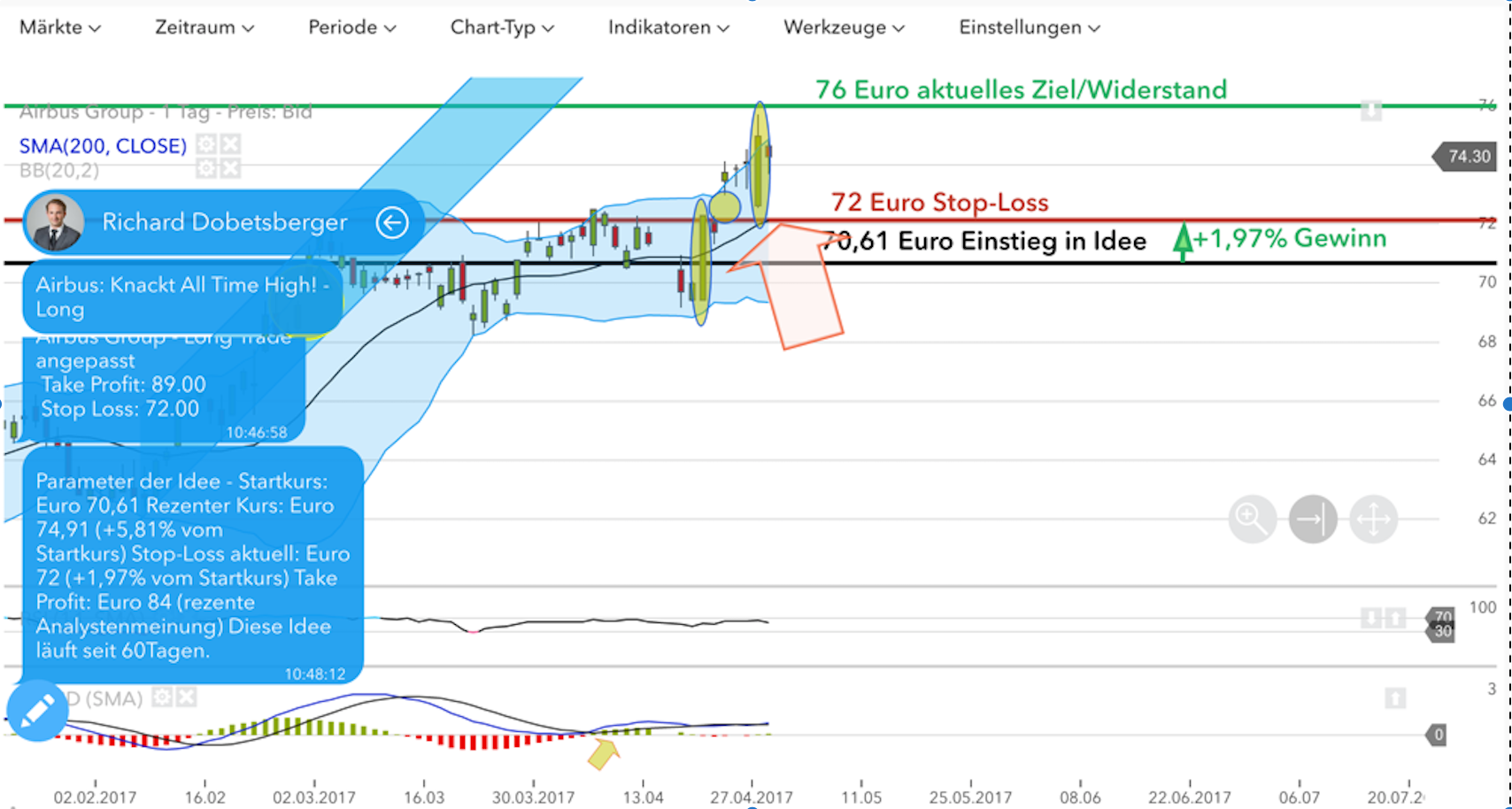Von den Analysten wird Airbus aktuell geliebt. Das Portal 4investors sprach sogar vom „Lieblingswert der Analysten“ (HIER). Die US-Investmentbank Goldman Sachs hat das Kursziel für Airbus nach Zahlen zum ersten Quartal von 84 auf 89 Euro angehoben und die Einstufung auf „Buy“ belassen (nachzulesen auf finanztreff.de). Das führt auch zu einer Anpassung im Take Profit in der Idee auf 89 Euro rezent!