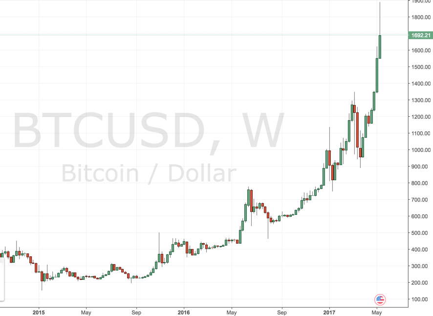 Waren die 1.550 im Kurs von Bitcoin zu US-Dollar hier schon das Ende der Fahnenstange? NEIN! Der Kurs legte täglich weiter zu und näherte sich fast unaufhaltsam der runden Marke von 2.000 – im Hoch knapp 1.900 BTC/USD (wie die offizielle Abkürzung lautet). Im Jahresvergleich per Freitag, den 12. Mai sind genau 94 Prozent Wertsteigerung zu verzeichnen. Und damit läuft Bitcoin dem Asset Gold in der Entwicklung eindeutig den Rang ab.