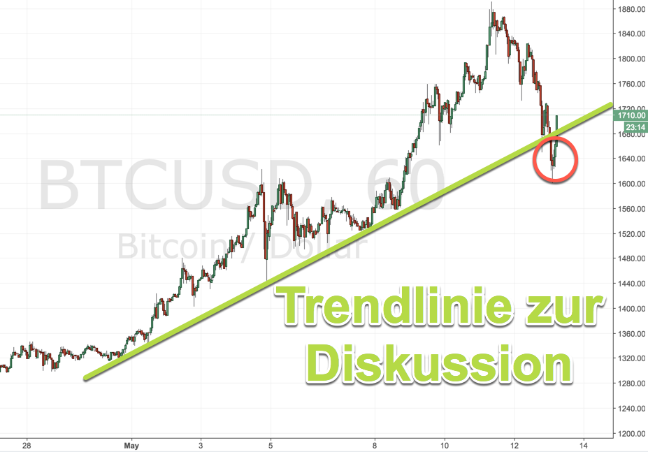 Das erste negative Signal im Chartbild erhalten wir im Stundenchart. Charttechniker arbeiten gerne mit Trendlinien. An dieser muss der Kurs mehrfache Berührungspunkte aufzeigen, um der Linie eine Wertigkeit zu verleihen. In der Zeiteinheit „Stundenchart“ besitzt so eine Linie schon eine sehr hohe Wertigkeit. Wenn sie dann noch über mehrere Tage hinweg immer wieder berührt wird und nicht bricht, kann sie als Orientierung dienen. So geschehen bei Bitcoin mit dem Ausbruch zum Start des Monats Mai. Ausgehend von diesem Punkt hatte sich folgende Trendlinie im Stundenchart etabliert.