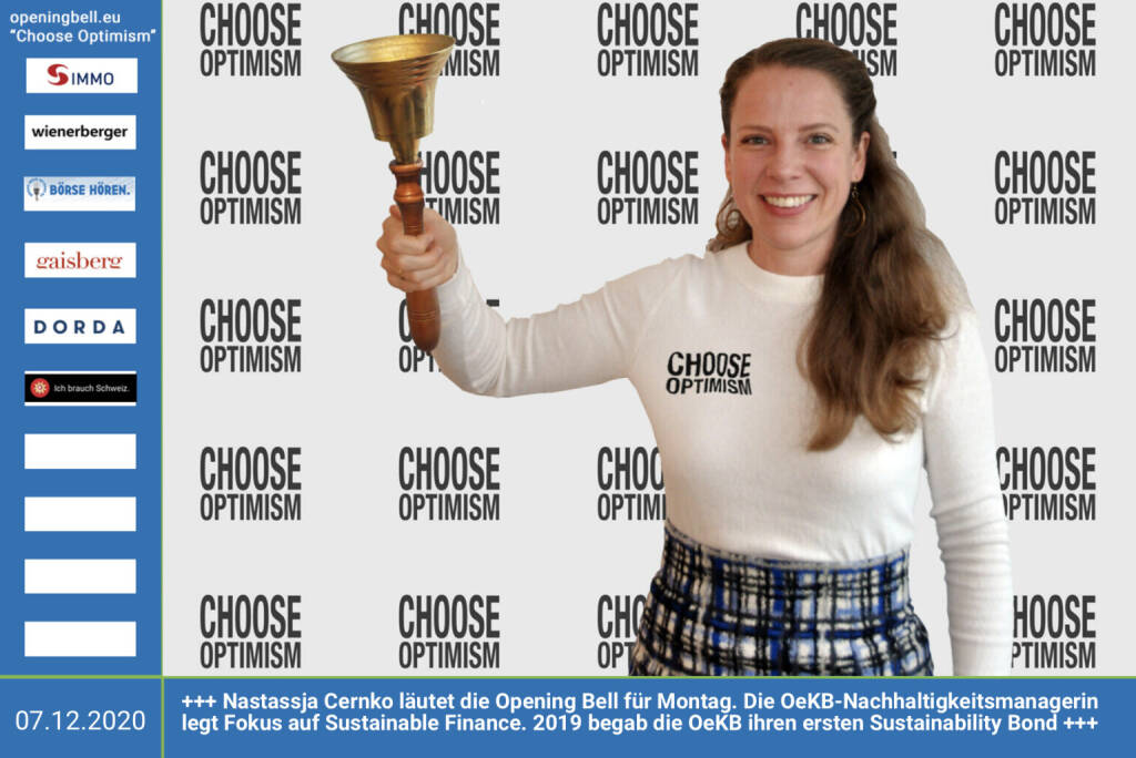 7.12.: Nastassja Cernko läutet die Opening Bell für Montag, Long Distance Style (vorher/nachher unter https://photaq.com//page/index/3781 ). Die Nachhaltigkeitsmanagerin der OeKB legt einen besonderen Fokus auf Sustainable Finance. 2019 begab die OeKB ihren ersten Sustainability Bond http://www.oekb.at - mehr Choose Optimism: https://boerse-social.com/category/choose_optimism https://www.facebook.com/chooseoptimism/