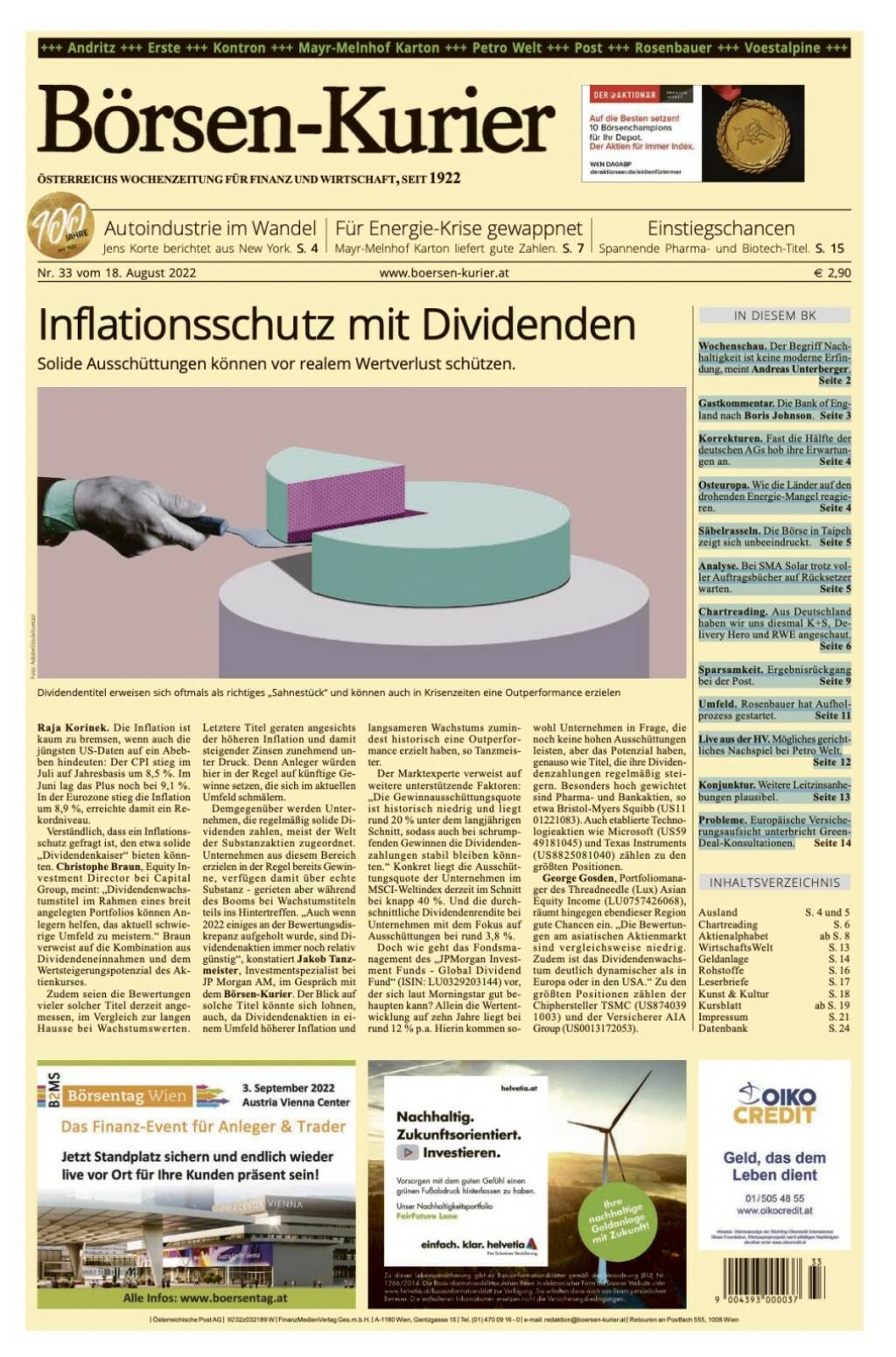 Und wieder ein Blick in den Börsen-Kurier Nr. 33 vom 18. August 2022: www.boersen-kurier.at