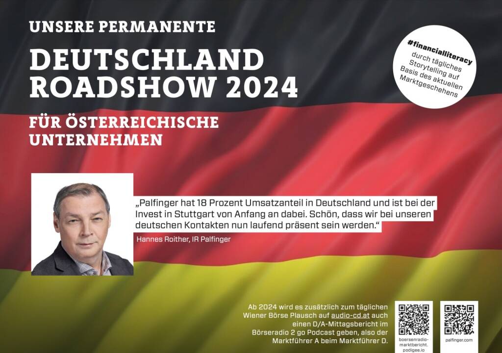Die Wiener Börse Pläusche sind ein Podcastprojekt für Audio-CD.at von Christian Drastil Comm. Unter dem Motto „Market & Me“ berichtet Christian Drastil über das Tagesgeschehen an der Wiener Börse. In Folge #510 geht es darum, dass mich meine Gesichtserkennung wieder erkennt, News zu Kontron, CA Immo, Delistings, Venionaire, voestalpine. Research zu Verbund, Rosenbauer, und EuroTeleSites. Weiters oute ich den 9. Ö-Partner unserer Deutschland-Roadshow 2024: Hannes Roither, IR Palfinger: „Palfinger hat 18 Prozent Umsatzanteil in Deutschland und ist bei der Invest in Stuttgart von Anfang an dabei. Schön, dass wir bei unseren deutschen Kontakten nun laufend präsent sein werden.“ Und gegen 18 Uhr gibt es FMA-Content in einer 30x30-Finanzwissen pur-Folge.