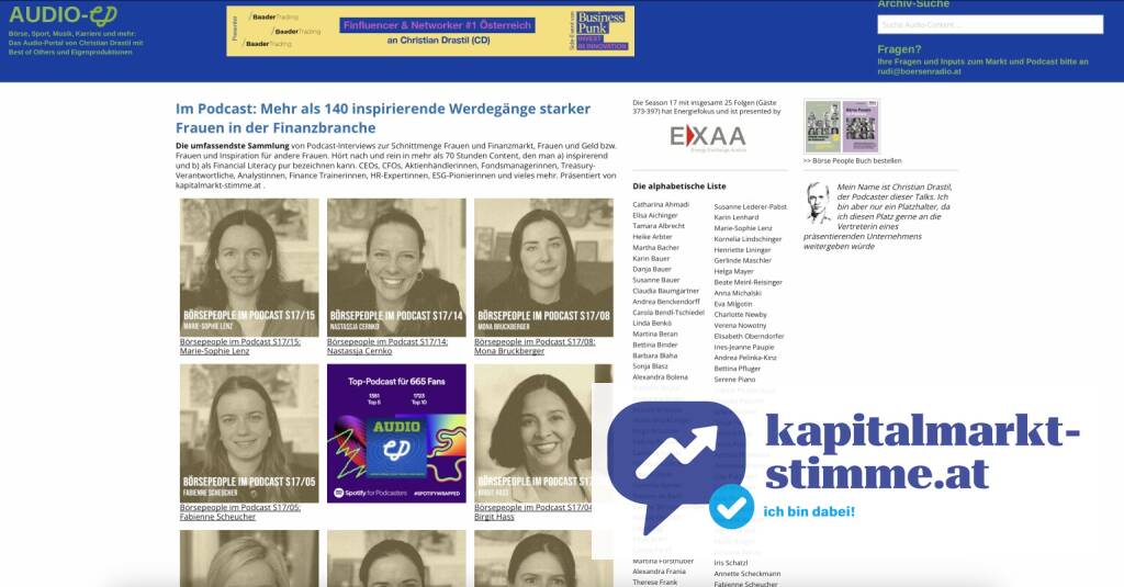 Die umfassendste Sammlung von Podcast-Interviews zur Schnittmenge Frauen und Finanzmarkt, Frauen und Geld bzw. Frauen und Inspiration für andere Frauen ist live. Hört nach und rein in mehr als 70 Stunden Content, den man a) inspirerend und b) als Financial Literacy pur bezeichnen kann. CEOs, CFOs, Aktienhändlerinnen, Fondsmanagerinnen, Treasury-Verantwortliche, Analystinnen, Finance Trainerinnen, HR-Expertinnen, ESG-Pionierinnen und vieles mehr: http://www.audio-cd.at/female .