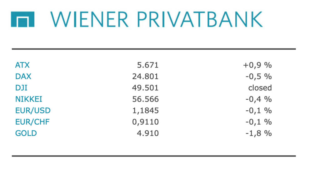 Aus den Morning News der Wiener Privatbank: "Der Wiener Aktienmarkt hat sich gestern zum Wochenauftakt von seiner positiven Seite gezeigt. Der Leitindex ATX stieg am Montag um 0,86 Prozent auf 5.671 Punkte. Der ATX Prime gewann 0,86 Prozent auf 2.823 Zähler. An den europäischen Leitbörsen zeigte sich ein uneinheitliches Bild. Der Wochenbeginn gestaltete sich ruhig. In den USA sind die Börsen wegen eines Feiertags geschlossen. In China gab es teilweise keinen oder nur verkürzten Handel. Auch an der Wiener Börse tat sich am Nachmittag wenig. In Wien traf Österreichs Wirtschaftsminister Wolfgang Hattmannsdorfer (ÖVP) den US-Botschafter Arthur Fisher. Danach kritisierte er die internationale Handelspolitik der USA scharf. "Ein Zollkrieg bringt niemandem etwas", erklärte der Minister. "Zölle und Handelsbarrieren sind kein Instrument für Aufschwung. Sie verteuern Investitionen, schwächen Lieferketten und können letztlich auch Konsumenten belasten." Am Vormittag präsentierte das EU-Statistikamt Eurostat die Industrieproduktion in der Eurozone. Demnach stieg die durchschnittliche jährliche Fertigung voriges Jahr um 1,5 Prozent. Im Dezember fuhren die Firmen die Produktion allerdings herunter: Sie war 1,4 Prozent niedriger als im Vormonat. Ökonomen hatten sogar mit einem Rückgang um 1,5 Prozent im Dezember gerechnet.