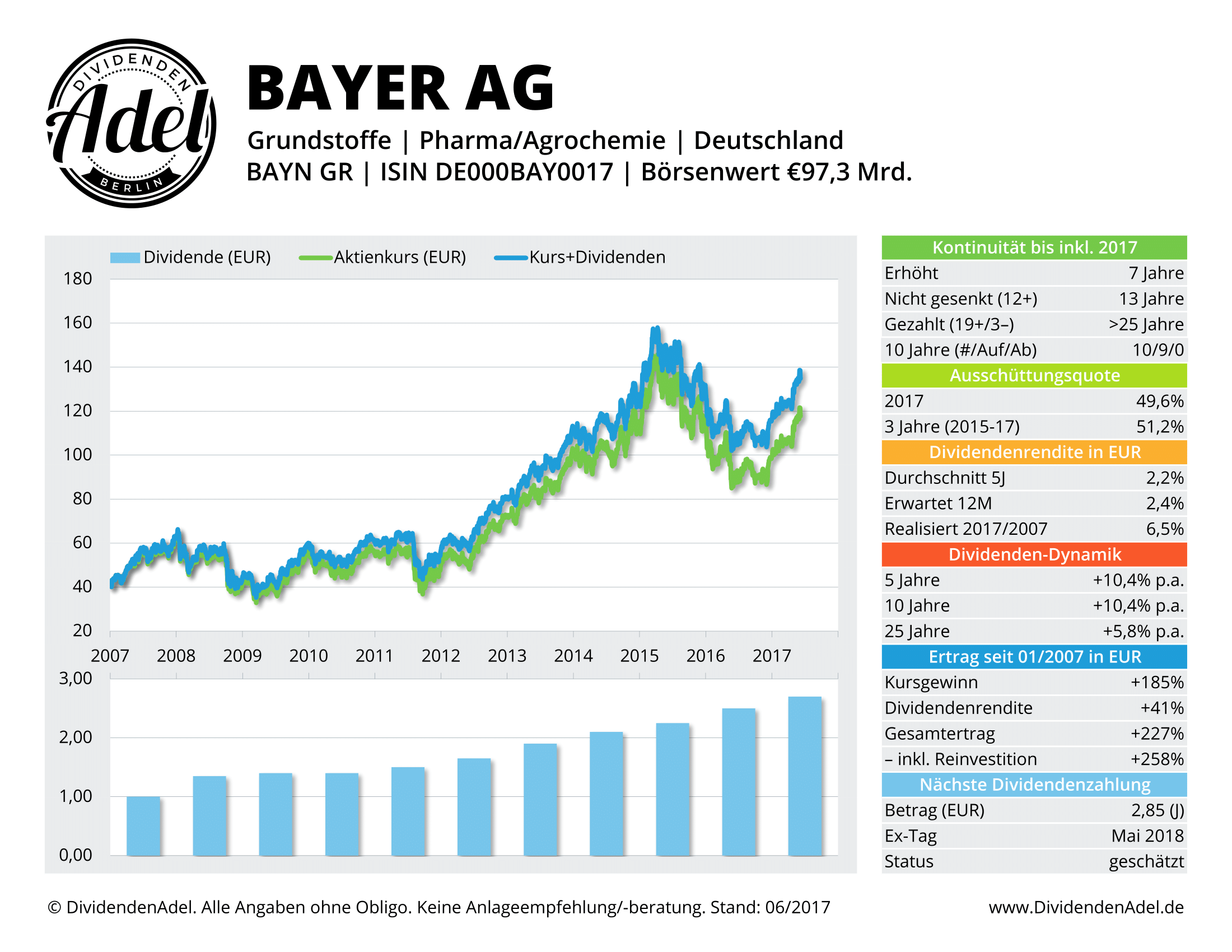 In puncto Dividendenkultur darf’s hingegen gerne andersherum laufen. Denn Monsanto kommt auf eine lupenreine Historie von 17 Anhebungen in Folge, während bei Bayer gerade einmal sieben zu Buche stehen. Mit 13 Jahren ohne Kürzung ist die Aspirin-Firma aber trotzdem DividendenAdel, auch weil der Payout vorbildlich und die Dynamik akzeptabel ist.