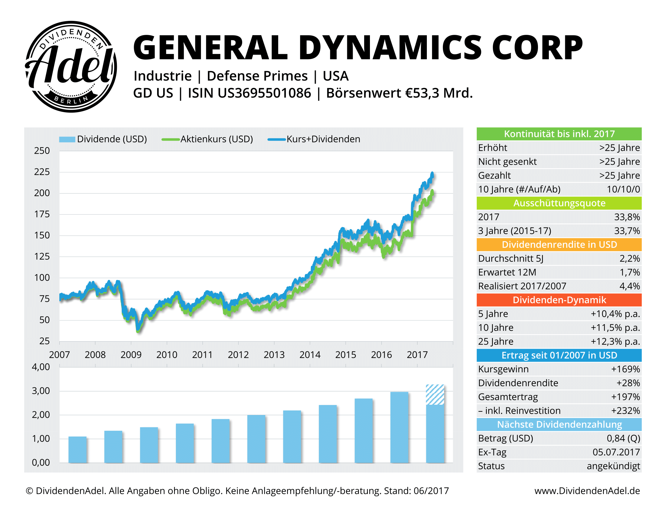Damit hat GD es inzwischen zu einem lupenreinen Dividenden-Aristokraten gebracht. Jahr für Jahr wird die Ausschüttung mit bemerkenswerter Konstanz um etwa 10% angehoben – wofür man sich nicht einmal besonders nach der Decke strecken muss: Die Payout-Quote liegt bei nur einem Drittel.