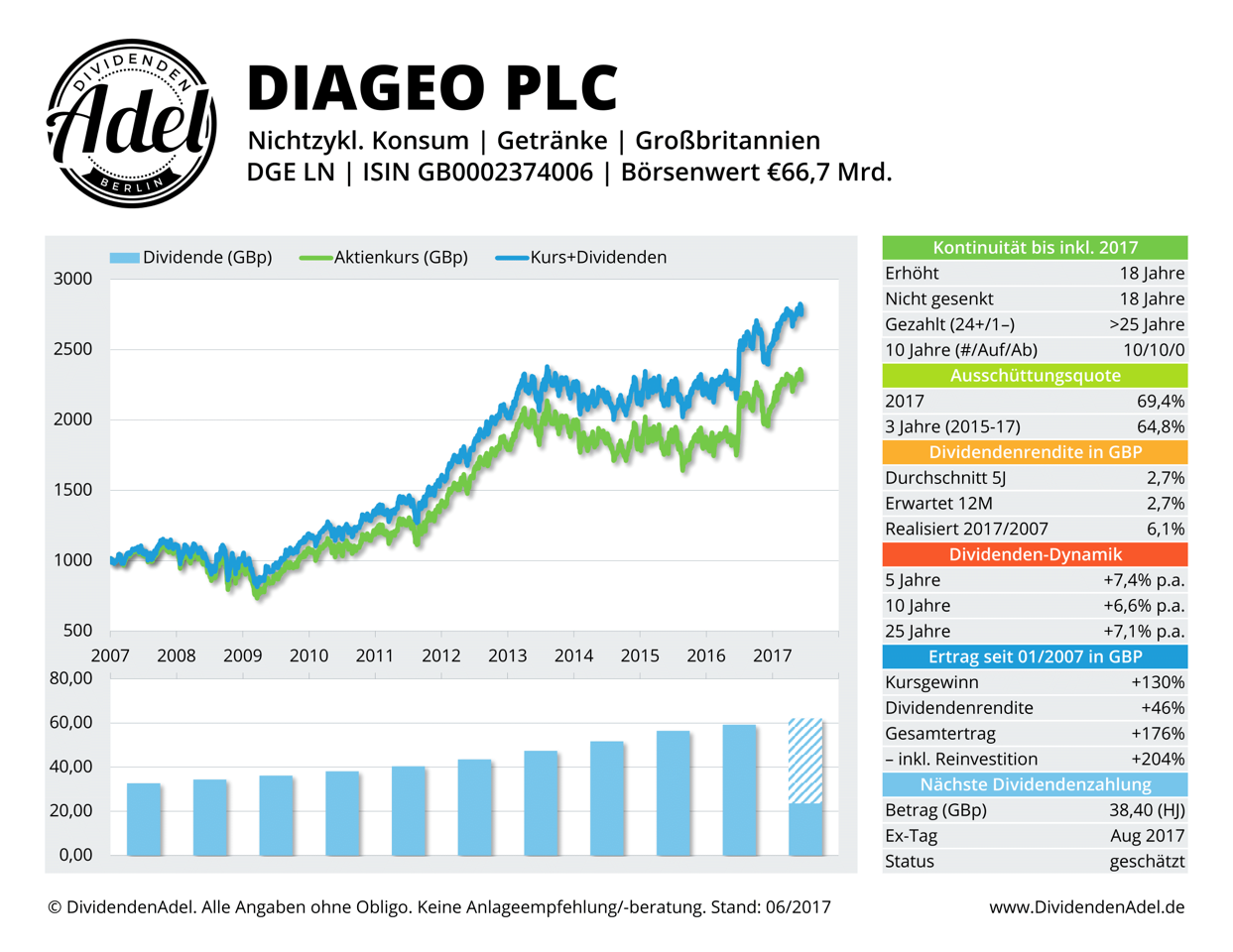 Zu verdanken ist diese hochprozentige Historie einem breit diversifizierten Portfolio mit bekannten Marken (u.a. Smirnoff, Tanqueray, Gordon’s, Captain Morgan, José Cuervo) – die zwar den Massenmarkt adressieren, gleichzeitig aber so gepreist sind, dass durchaus attraktive Margen bleiben.
