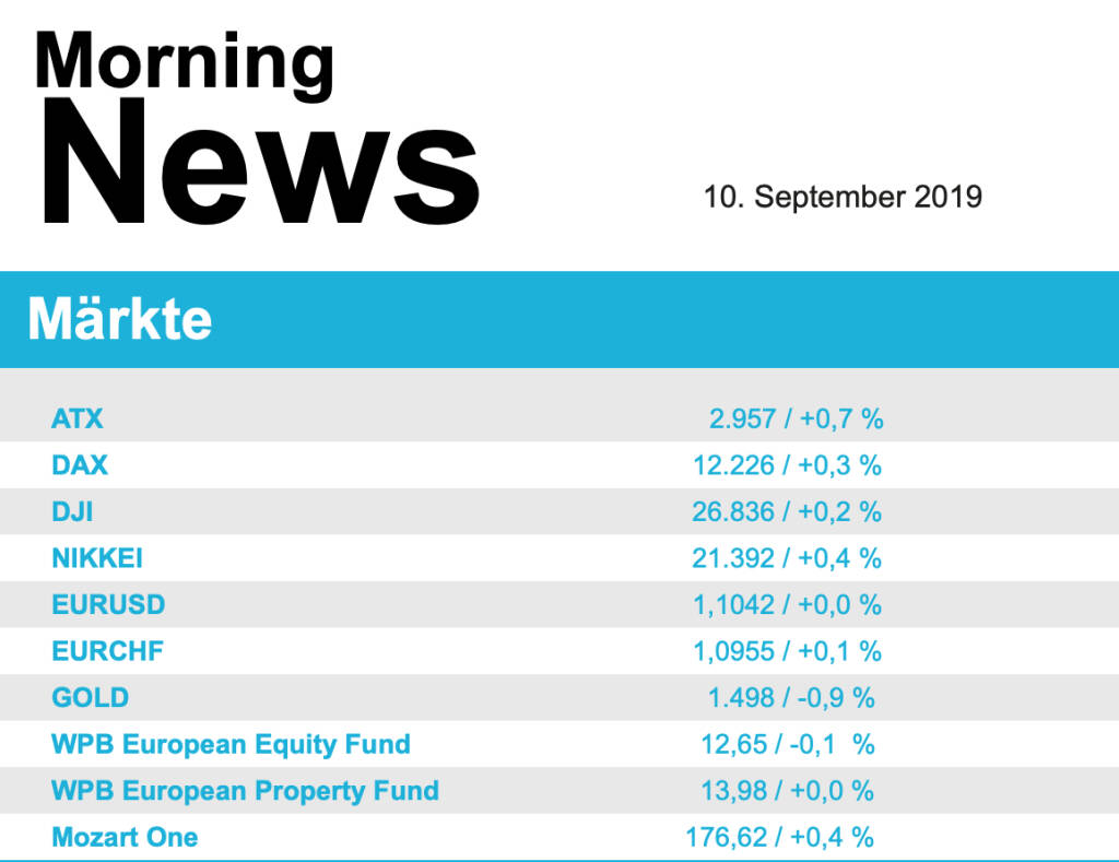 Vorbörslich sind die Märkte heute Dienstag in Europazur Eröffnung leicht schwächert indiziert. Die asiatischen Börsen tendieren heute bislang uneinheitlich. Makroökonomisch stehen heute die Industrieproduktion (FRA und ITA) sowie die Arbeitslosenzahlen in UK im Fokus der Märkte. Unternehmensseitig erwarten wir die Verkehrsergebnisse des Flughafen Wien für August 2019.