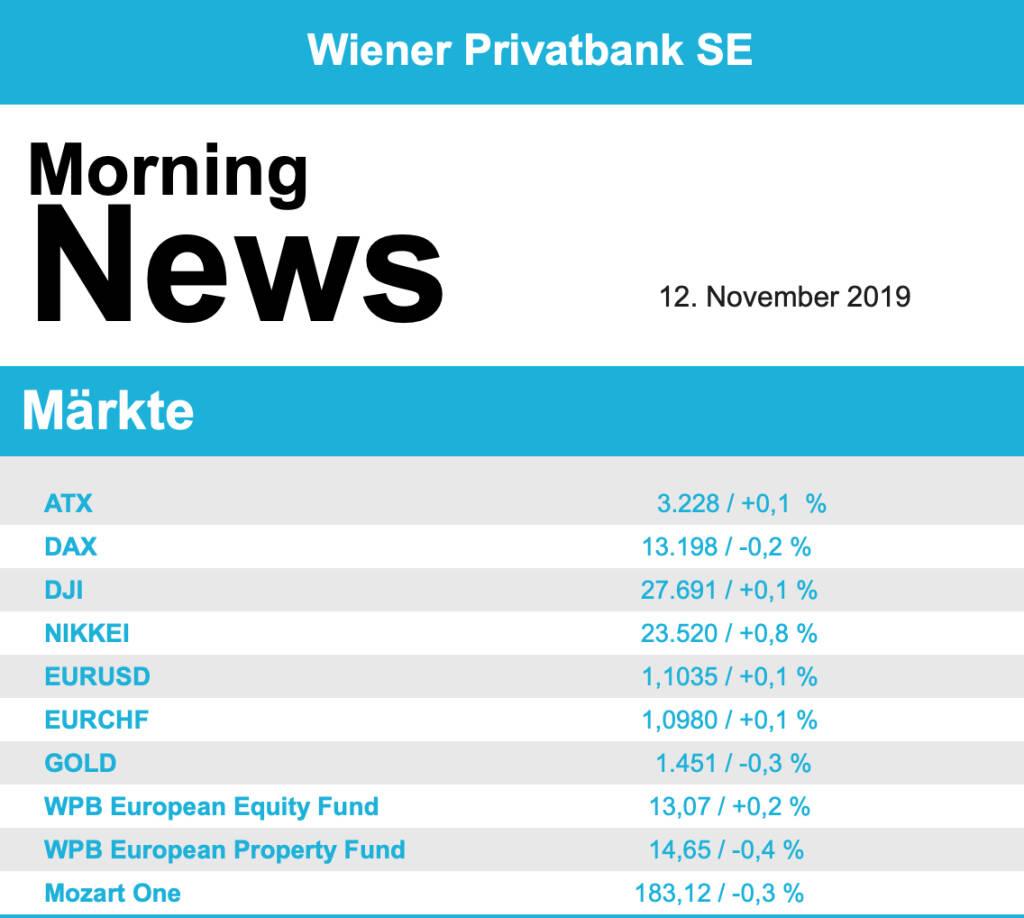 Vorbörslich sind die Märkte in Europa heute Dienstag zur Eröffnung höher indiziert. In Asien beenden die Börsen den heutigen Handelstag uneinheitlich mit leicht freundlichen Grundton. Unternehmensseitig gab es heute bereits Geschäftszahlen von Rosenbauer (siehe unten). Makroökonomisch erwarten wir aus Europa die Arbeitslosenzahlen für Oktober 2019 aus Großbritannien sowie den ZEW-Konjunkturindex aus Deutschland.