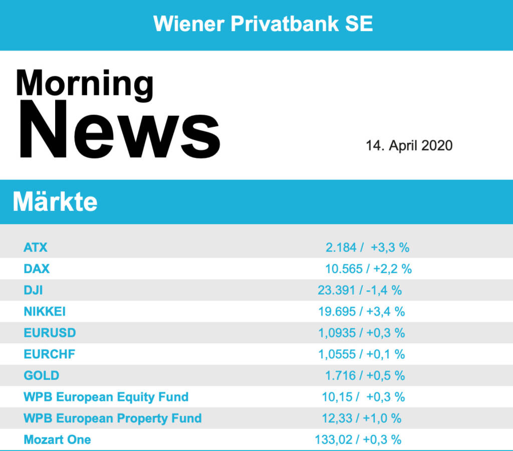 Vorbörslich sind die Märkte in Europa heute Dienstag zur Eröffnung freundlich indiziert. Auch die Börsen in Asien verzeichneten Kursgewinne. Unternehmensseitig veröffentlichte Flughafen Wien heute bereits die Verkehrsergebnisse für März 2020 (siehe unten). Makroseitig stehen in den USA die Im- und Exportpreise im Fokus der Märkte.