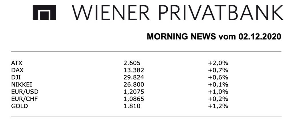 Mit einem deutlichen Zuwachs konnte auch der heimische Markt in den Dezember starten, der ATX erzielte eine Verbesserung von 2,0% und konnte damit die Vortagsverluste egalisieren. Zu den Aktien im Fokus zählte Zumtobel, wo gestern die Ergebnisse präsentiert wurden. Der Leuchtenhersteller hat zwar in der Corona-Krise viel Umsatz verloren, ist aber für die Zeit danach optimistisch. Der Gewinn hat sich zwar halbiert, das Unternehmen konnte allerdings, trotz eines deutlich zurückgegangenen Umsatzes, in den schwarzen Zahlen bleiben, in Summe bedeutete das ein Minus von 2,2% für die Aktie. Warburg Research hat die Kaufempfehlung für Porr bestätigt und auch das Kursziel von 20,0 Euro unverändert belassen, der Titel konnte sich leicht um 0,2% verbessern.