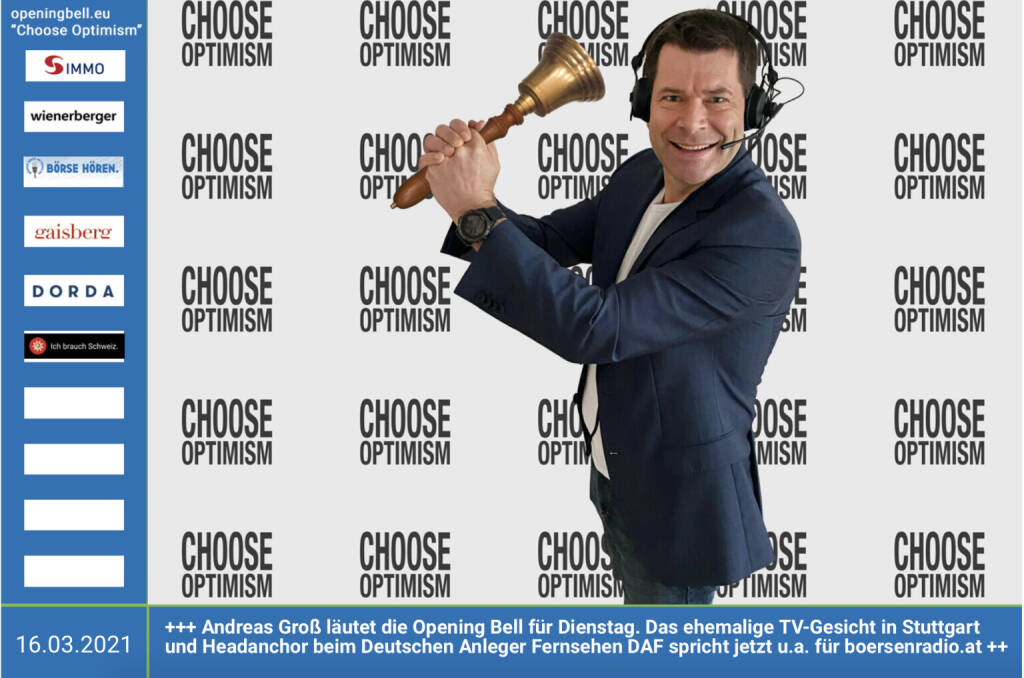 16.3.: Andreas Groß läutet die Opening Bell für Dienstag. Das ehemalige TV-Gesicht am Börsenplatz Stuttgart und Headanchor beim Deutschen Anleger Fernsehen DAF spricht jetzt u.a. für http://www.boersenradio.at Choose Optimism: https://boerse-social.com/category/choose_optimism https://www.facebook.com/chooseoptimism/