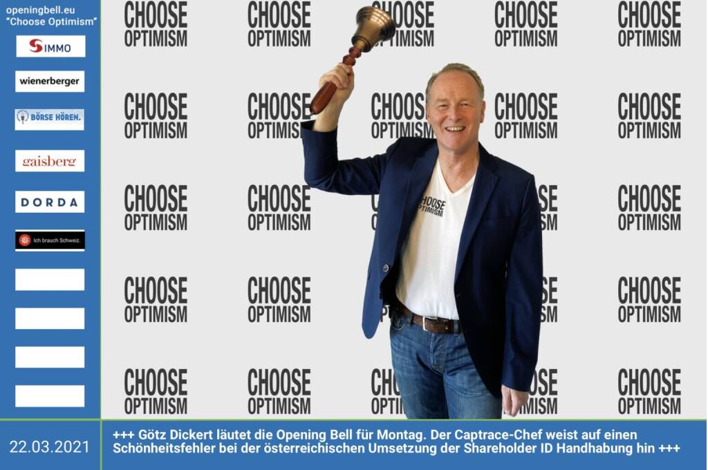 22.3.: Götz Dickert läutet die Opening Bell für Montag. Der Captrace-Chef weist auf einen Schönheitsfehler bei der österreichischen Umsetzung der Shareholder ID Handhabung hin, siehe hier: https://boerse-social.com/2021/03/18/shareholder_id_tolle_osterreichische_umsetzung_mit_schonheitsfehler_friendly_takeover_8_gotz_dickert_geschaftsfuhrer_captrace_gmbh_gotz_dickert https://www.captrace.de https://www.facebook.com/chooseoptimism/