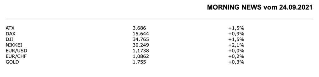 Erneut deutliche Zuwächse gab es für den heimischen Markt, das Plus von 1,5% für den ATX lag den zweiten Tag in Folge über dem europäischen Durchschnitt. Auch in Wien beflügelte das Ergebnis der Fed-Sitzung die Stimmung, die US-Notenbank bereitete die Märkte weiter darauf vor, ihre Corona-Anleihekäufe zurückzuschrauben. Bei der nächsten Sitzung Anfang November könne eine Drosselung der milliardenschweren Wertpapierkäufe beschlossen werden, hatte Fed-Chef Jerome Powell am Vorabend nach Börsenschluss in Europa gesagt, aktuell wird aber an der sehr lockeren Geldpolitik festgehalten. Die Meldungslage zum heimischen Aktienmarkt gestaltete sich sowohl auf Unternehmensebene als auch von Analystenseite äußerst mager. Sehr stark waren auch am heimischen Markt die Banken, die Bawag konnte ein Plus von 2,3% erzielen, die Erste Group verzeichnete einen Zuwachs von 3,2% und die Raiffeisen Bank International konnte um 2,4% vorrücken. Gemischt verlief der Handel für die Ölwerte, während es für die OMV eine weitere Verbesserung von 2,0% gab, musste Schoeller-Bleckmann dem starken Vortagszuwachs etwas Tribut zollen und um 0,5% tiefer aus dem Handel gehen. Schwächster Wert des gestrigen Handels war UBM Development, der Immobilienentwickler verzeichnete ein Minus von 2,0%, auch Mayr-Melnhof litt unter Gewinnmitnahmen, für den Kartonhersteller ging es um 1,2% nach unten. Gut nachgefragt war Andritz, der Anlagenbauer war mit einem Anstieg von 2,0% einer der stärksten Titel des gestrigen Handels, auch der Flughafen Wien konnte sich verbessern und 1,9% fester schliessen. Ebenfalls zu den Gewinnern zählte Uniqa, für den Versicherungskonzern ging es um 1,7% nach oben, und auch der Verbund hatte einen guten Tag und konnte um 1,6% vorrücken.