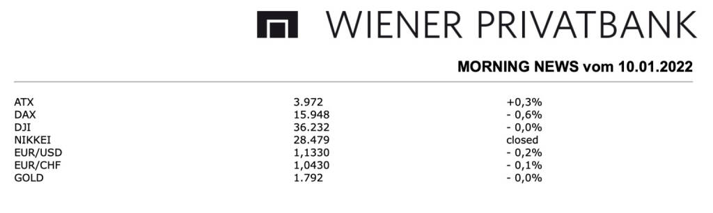 Aus den Morning News der Wiener Privatbank: Für die heimische Börse gab es zum Wochenausklang einen leichten Zuwachs, der ATX konnte 0,3% höher schliessen, was für die gesamte Woche gesehen einen Zuwachs von stolzen 3,0% bedeutete. Nach einem schwachen Start konnte sich das heimische Börsenbarometer mit einigen Auf und Abs kontinuierlich nach oben bewegen und diese Zuwächse auch bis zum Schluss verteidigen. Neben den US-Arbeitsmarktdaten standen auch die Verbraucherpreise im Fokus, in der Eurozone ist die Inflationsrate im Dezember mit 5,0 Prozent auf den höchsten Stand seit Einführung des Euro gestiegen, allgemein war ein leichter Rückgang erwartet worden, zusätzlich hat sich auch die Wirtschaftsstimmung in der Eurozone etwas eingetrübt, der Economic Sentiment Indicator gab etwas stärker nach als erwartet. Kursbewegende Unternehmensnachrichten blieben auch am Freitag wie schon in der gesamten Woche Mangelware, stark waren die Banken, die so dank ihrer starken Gewichtung zur guten Performance des Index beitrugen, die Bawag konnte sich um 2,5% verbessern, die Erste Group verzeichnete ein Plus von 0,7%, für die Raiffeisen Bank International ging es ebenfalls um 0,7% nach oben und die Addiko Bank konnte um 0,4% anziehen. Auch die Ölwerte hatten im Gleichklang mit dem europäischen Sektor einen guten Tag, die OMV erzielte einen Anstieg von 1,4%, für Schoeller-Bleckmann ging es um 0,9% nach oben. Etwas anders war die Situation bei den Versicherungsunternehmen, diese konnten nur bedingt von den großen Konkurrenten profitieren, uniqa musste 1,6% nachgeben, für die Vienna Insurance Group gab es ein leichtes Plus von 0,4%. Die Liste der Verlierer wurde von AT&S angeführt, für den Halbleiterhersteller ging es um 3,9% nach unten, auch Do & Co wurde verkauft, das Cateringunternehmen musste 2,8% nachgeben. An die Spitze der Kursübersicht konnte sich erneut Frequentis setzen, der Audio-Softwareanbieter verzeichnete einen weiteren bemerkenswerten Zuwachs von 8,2%. Gut nachgefragt war auch Amag, für den Aluminiumhersteller ging es um 3,0% nach oben, auch Zumtobel hatte einen guten Tag und konnte mit einem Anstieg von 1,8% aus dem Handel gehen. Am Donnerstag stehen ein Ergebnisbericht von Agrana sowie ein Trading Update von der OMV auf dem Programm.