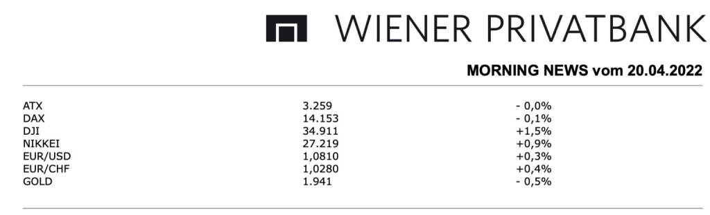 Aus den Morning News der Wiener Privatbank: Mehr oder weniger ohne Veränderung endete der erste Handelstag der verkürzten Woche in Wien, der ATX musste lediglich das kleinstmögliche Minus von 0,01% hinnehmen. Nach einem schwachen Beginn konnte sich der heimische Index relativ schnell in die Gewinnzone setzen, musste dann aber wieder abgeben, um am Nachmittag neuerlich deutlich in den positiven Bereich vorzustossen, ehe gegen Ende wieder Verkäufe einsetzten und die vorherigen Gewinne wieder abgegeben werden mussten. Insgesamt waren unter den Anlegern eine Reihe von Belastungsfaktoren zu spüren, neben dem Krieg in der Ukraine und den möglichen daraus resultierenden Folgen für die österreichische Wirtschaft waren es auch Inflationssorgen angesichts stark gestiegener Rohstoffpreise, Störungen in der Lieferkette sowie Lockdown-Maßnahmen in China.