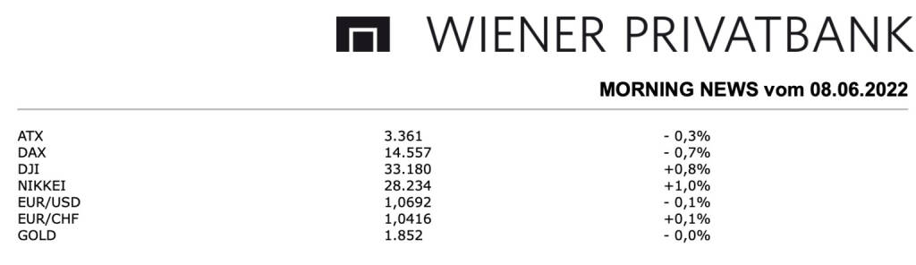 Aus den Morning News der Wiener Privatbank: Nach dem Feiertag am Pfingstmontag präsentierte sich der heimische Aktienmarkt schwächer. Der ATX startete bereits zu Beginn tiefer und schaffte es im Laufe des Tages nicht aus der Verlustzone zu kommen. Zu Handelsschluss stand ein Verlust von 0,3 Prozent bei 3.360,83 Punkte fest. Die Meldungslage von den Unternehmen und der Konjunktur war sehr dünn. Die Stimmung war geprägt von Inflationsängsten und die Sorge um Zinserhöhungen. Verlierer des Tages war ohne spezifische News die Immofinanz mit einem Abschlag von 16,2 Prozent, gefolgt von Rosenbauer mit 3,1 Prozent minus. Bei den Banken war die RBI mit minus 1,2 Prozent der Verlierer. Die BAWAG war eine Spur besser mit einem Abschlag von einem Prozent und die Erste Group verbuchte einen minimalen Verlust von 0,03 Prozent. Die kleine Addiko Bank konnte den Tag mit einem Minus von 0,9 Prozent beenden. Die Gewinner des Tages waren Kapsch TrafficCom mit einem Gewinn von 4,4 Prozent, gefolgt von Porr mit 3,3 Prozent plus. Heute wird voestalpine über das abgelaufene Geschäftsjahr berichten.