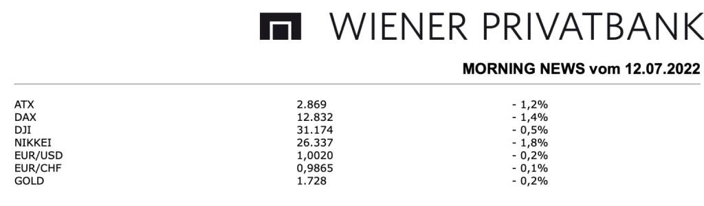 Aus den Morning News der Wiener Privatbank: Die Wiener Börse hat den Montagshandel mit Verlusten beendet, der ATX sank zum Beginn der Woche um 1,2%. Eine negative Stimmung aus Asien, wo in China wegen erneut steigender Corona-Infektionszahlen wieder neue Beschränkungsmaßnahmen drohen, lastete den gesamten Tag lang auf den Märkten, zudem begannen zum Wochenbeginn die Wartungsarbeiten an der Pipeline Nord Stream 1, die zehn Tage andauern werden und weswegen zunächst kein Gas mehr von Russland nach Europa fließt. Es herrschte allerdings die Sorge, dass auch nach den Wartungsarbeiten der Gashahn abgedreht bleibt. Bei den Einzeltiteln mussten vor allem die großen Banken Verluste hinnehmen, die Bawag verzeichnete ein Minus von 1,1%, für die Erste Group ging es um 2,4% nach unten, die Raiffeisen Bank International geriet am deutlichsten unter Druck und verzeichnete einen Rückgang von 3,8% und auch die kleinere Addiko Bank musste mit einem Minus von 1,8% aus dem Handel gehen. Für die OMV ging es nach dem deutlichen Zuwachs vor dem Wochenende wieder um 2,7% Richtung Süden, der russische Staatskonzern Gazprom hat dem Konzern nach Beginn der Nord-Stream-1-Wartung die Liefermengen weiter gekürzt, die OMV erhält rund 70 Prozent weniger als ursprünglich vereinbart, wie der Konzern mitteilte, seit Mitte Juni hat Gazprom ungefähr die Hälfte der bestellten Menge geliefert. Die Erste Group kappte das Kursziel für Zumtobel von 9,5 Euro auf 7,3 Euro, gleichzeitig wurde die Einstufung als „Hold“ bestätigt, für den Leuchtenhersteller gab es dadurch einen Abschlag von 1,0%. Ebenfalls einen schwachen Tag hatte voestalpine, der Stahlkonzern musste um 3,8% nachgeben. An die Spitze der Kursübersicht konnte sich der Verbund mit einem Zuwachs von 3,5% setzen, für den Branchenkollegen EVN gab es eine vergleichsweise bescheidene Verbesserung von 0,2%. Ebenfalls zu den Gewinnern zählte Frequentis, das Softwareunternehmen konnte sich um 1,6% verbessern, auch Kapsch TrafficCom erfreute sich reger Nachfrage und konnte mit einem Zuwachs von 1,0% aus dem Handel gehen.