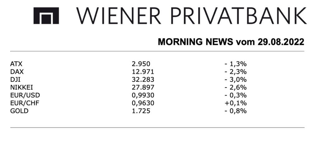Aus den Morning News der Wiener Privatbank: Die Wiener Börse hat am Freitag mit Kursverlusten geschlossen. Der heimische Leitindex hatte sich über weite Strecken im Plus gezeigt, nach Eröffnung der Wall Street und der Rede von US-Notenbankchef Jerome Powell ging es aber stetig nach unten. Letztendlich musste der ATX 1,3% nachgeben, was für die gesamte Woche gesehen einen Rückgang von 2,8% bedeutete. In seiner Rede stellte der US-Notenbank-Chef weitere Zinserhöhungen in Aussicht und erklärte, dass die Wiederherstellung der Preisstabilität wahrscheinlich die Fortsetzung einer restriktiven Geldpolitik für einige Zeit notwendig mache. Zudem spricht in seinen Augen die historische Erfahrung dagegen, die Geldpolitik zu früh zu lockern, er gab keine klaren Signale für das nächste Meeting, deutete jedoch an, dass ein außergewöhnlich großer Zinsschritt notwendig werden könnte. Ansonsten blieben Unternehmensnachrichten weitgehend aus, am Nachmittag sorgten Analystenkommentare für Impulse bei einigen Werten. So hat die Wiener Privatbank das Kursziel für Schoeller-Bleckmann von 63,1 Euro auf 76,1 Euro erhöht und gleichzeitig die Einstufung von „Halten“ auf „Kaufen“ nach oben revidiert, der Ölfeldausrüster konnte gegen den Markttrend um 1,2% fester schliessen. Raiffeisen Research revidierte das Kursziel für Frequentis von 28,0 Euro auf 33,0 Euro nach oben und bestätigte gleichzeitig die Einschätzung als „Hold“, diese Einstufung wurde mit der starken Kursentwicklung und der aktuellen Bewertung begründet, der Audio-Softwareanbieter musste 1,9% nachgeben.