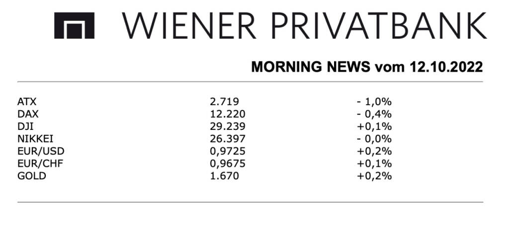Aus den Morning News der Wiener Privatbank: Erneut zu einem Kursrückgang kam es für den heimischen Markt, der ATX musste mit einem Minus von 1,0% aus dem Handel gehen. Am Nachmittag kam zusätzliche Belastung von einer wieder schwächer gestarteten Börse in den USA, dort drehte sich aber dann die Stimmung und auch das heimische Börsenbarometer konnte die Verluste eingrenzen. Allgemein herrschte Zurückhaltung vor der heutigen Veröffentlichung des Protokolls der letzten Fed-Sitzung und den Inflationsdaten in den USA, auch lastete die anhaltende Eskalation im Ukraine-Krieg auf der Stimmung. Zudem wurde vom IWF mitgeteilt, dass erwartet wird, dass sich die globale Konjunktur nächstes Jahr weiter abkühlen wird, ein Drittel der Weltwirtschafte dürfte diesem Report gemäß bis 2023 in eine Rezession rutschen.