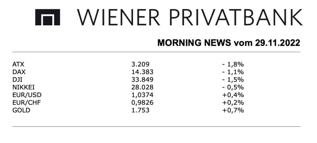 Aus den Morning News der Wiener Privatbank: Die Wiener Börse hat sich am Montag mit klaren Verlusten aus dem Handel verabschiedet, Druck kam vor allem von den wieder aufgeflammten Sorgen um die Covid-Politik Chinas, im Späthandel sorgte zudem eine schwache Eröffnung an der Wall Street für zusätzliche Abgaben, der ATX musste schlussendlich mit einem Minus von 1,8% aus dem Handel gehen. Die in China stattfindenden Proteste der Bevölkerung gegen die strikten Maßnahmen der Null-Covid-Politik Pekings brachten am Anfang der Woche deutlichen Gegenwind an den Finanzmärkten, denn dadurch steigen die Unsicherheiten, und es wurde wieder vermehrt auf den wirtschaftlichen Einfluss der rigiden Beschränkungen aufmerksam gemacht, der die Konjunktur im Reich der Mitte und auch weltweit wieder deutlich belasten könnte. Auf Unternehmensseite stand Porr mit der Ergebnisvorlage im Mittelpunkt des Interesses, der Baukonzern hat in den ersten neun Monaten des Jahres Umsatz und Gewinn deutlich gesteigert, auch der Auftragsbestand legte deutlich auf 7,8 Milliarden Euro zu, dennoch gab es für die Aktie gestern einen Rückgang von 1,6%. S Immo hat dieses Jahr von Januar bis September weniger Gewinn gemacht, in den ersten drei Quartalen lag das Periodenergebnis bei 99,1 Millionen Euro, nach 160,5 Millionen Euro im Jahr zuvor, die Gesamterlöse sind in diesem Zeitraum jedoch um mehr als 40 Millionen Euro auf 185,1 Millionen Euro gestiegen, das alles konnte den Sinkflug des Titels nicht aufhalten, gestern ging es um weitere deutliche 10,4% nach unten, was auch den Schlussplatz in der Kursübersicht bedeutete. Deutliche Abgaben setzte es auch für die großen heimischen Bankenwerte, die Bawag musste mit einem Abschlag von 3,9% aus dem Handel gehen, für die Erste Group ging es um 1,7% nach unten und die Raiffeisen Bank International endete mit einem Minus von 2,3%. An die Spitze der Kursübersicht konnte sich Kapsch TrafficCom mit einem Anstieg von 3,1% setzten, auch der Flughafen Wien und FACC zählten zu den Gewinnern, für diese beiden Werte ging es um 1,4% beziehungsweise um 1,2% nach oben.