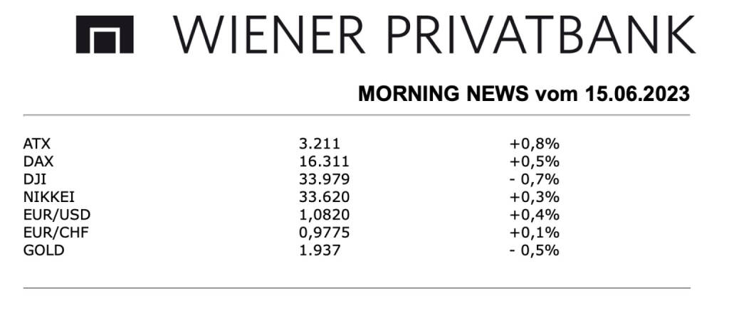 Aus den Morning News der Wiener Privatbank: "Der Wiener Aktienmarkt hat den Handel gestern Mittwoch mit Zuwächsen beendet. US-Erzeugerpreisdaten hatten am Nachmittag die Erwartung untermauert, dass die US-Notenbank Fed den Leitzinssatz am Abend nicht anheben wird. Der Leitindex ATX ging bei 3.211,12 Punkten aus dem Handel - 0,82 Prozent über dem Vortagesschluss. Der ATX Prime gewann 0,82 Prozent auf 1.624,46 Zähler. In den USA sind die Erzeugerpreise im Mai gegenüber dem Vorjahr um 1,1 Prozent gestiegen und gegenüber dem Vormonat um 0,3 Prozent gefallen, wie im Verlauf bekannt wurde. Die Preisentwicklung bei den Herstellerpreisen war damit stärker rückläufig als von Analysten erwartet. Heute Donnerstag wird auch die Europäische Zentralbank (EZB) über ihren Leitzins entscheiden. Hier gehen die Marktbeobachter im Schnitt von einer Anhebung um 0,25 Prozentpunkte aus.