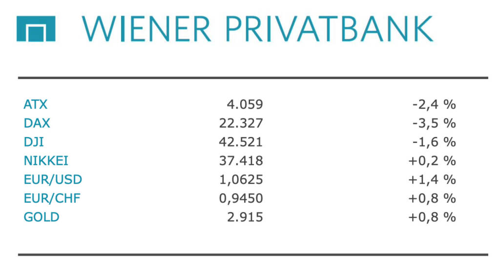 Aus den Morning News der Wiener Privatbank: "Die Wiener Börse hat am Dienstag mit sehr schwacher Tendenz geschlossen. Der Leitindex ATX rutschte gegenüber dem Montag um 2,35 Prozent auf 4.059,15 Zähler ab. Der ATX Prime schloss mit einem klaren Minus von 2,30 Prozent bei 2.031,92 Einheiten. Das europäische Umfeld zeigte sich ebenfalls tiefrot und auch die US-Aktienmärkte starteten schwächer in die Sitzung. Belastend für die internationalen Aktienmärkte wirkte vor allem der sich weiter zuspitzende Zollstreit der USA mit China, Mexiko und Kanada. Laut US-Medien sind die von US-Präsident Donald Trump angekündigten Zölle für Waren aus Mexiko und Kanada in Kraft getreten. Zudem hat Trump per Dekret angeordnet, die im Februar angeordneten Importzölle auf Waren aus China zu verdoppeln. Die Börsen sind politisch getrieben wie lange nicht. Zugleich steigt mit der Dominanz politischer Themen auch die Schwankungsanfälligkeit. Der Handelskrieg ist in vollem Gange und die Gefahr groß, dass es am Ende nur Verlierer gebe.