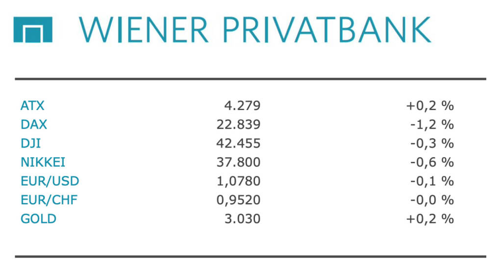 Aus den Morning News der Wiener Privatbank: "Der Wiener Aktienmarkt hat gestern Mittwoch den Handel etwas höher beendet. Der österreichische Leitindex ATX gewann zum Sitzungsende 0,19 Prozent auf 4.278,54 Zähler. An den europäischen Leitbörsen dominierten hingegen die negativen Vorzeichen. Vor einer möglichen Bekanntgabe weiterer US-Zölle verhielten sich die Akteure international abwartend. Auch an der Wall Street ging es im Verlauf mehrheitlich deutlich abwärts. In Wien legten die schwergewichteten Banken mehrheitlich zu und unterstützten damit den ATX. Die Aktionäre der Raiffeisen Bank International konnten ein Plus von 1,6 Prozent verbuchen. Erste Group verteuerten sich um 0,4 Prozent. Bawag -Papiere fielen hingegen um 0,9 Prozent. Von Analystenseite meldete sich die Erste Group zur OMV -Aktie und stufte die Titel von "Hold" auf "Accumulate" hoch. Das Kursziel wurde gleichzeitig von 39,7 auf 53 Euro erhöht. Die OMV-Papiere reagierten mit plus 1,3 Prozent auf 47,3 Euro.