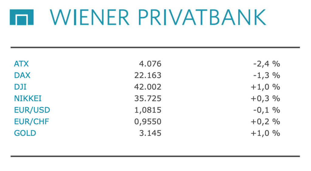 Aus den Morning News der Wiener Privatbank: "Die Wiener Aktienindizes haben gestern Montag kräftig nachgegeben. Wie bereits am Freitag lastete die Angst vor neuen US-Zöllen auf der Anlegerstimmung. Der Leitindex ATX schloss 2,38 Prozent tiefer bei 4.076,36 Punkten. Der marktbreitere ATX Prime büßte 2,35 Prozent ein bei 2.048,48 Zählern. Keine starke Auswirkung am Markt hatten am Nachmittag veröffentlichte Inflationsdaten aus Deutschland. Die deutsche Inflationsrate ist im März gesunken. Morgen Mittwoch will US-Präsident Donald Trump dann ein groß angelegtes Zollpaket verkünden. So dürften reziproke Zölle gegen alle Länder angekündigt werden, wie Trump jüngst bekräftigte. Nach dem 2. April sei er aber zu "Deals" mit Ländern, die die US-Zölle vermeiden wollen, bereit. Ganz unten standen in Wien die ex-Dividende gehandelten Aktien der Raiffeisen Bank International (RBI) und von Andritz , die um 7,1 und 8,3 Prozent nachgaben. Porr-Titel fielen um 2,6 Prozent auf 26,25 Euro. Analysten von Warburg Research haben ihr Kursziel für die Aktien des Baukonzerns von 29 auf 36 Euro je Aktie erhöht. Der zuständige Experte hat weiters die Kaufempfehlung "Buy" bestätigt.