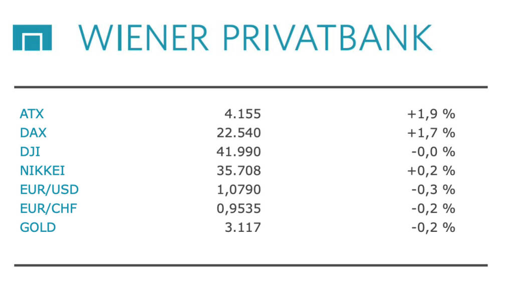 Aus den Morning News der Wiener Privatbank: "Die Wiener Börse hat gestern Dienstag mit sehr fester Tendenz geschlossen. Der heimische Leitindex ATX stieg gegenüber dem Montag- (4.076,36) um 1,93 Prozent auf 4.154,90 Zähler. Der ATX Prime schloss mit einem Plus von 1,91 Prozent bei 2.087,54 Einheiten. Auch die europäischen Leitbörsen konnten klare Zugewinne verbuchen. Marktbeobachter sprachen von einem Stabilisierungsversuch. Die Anleger bleiben aber vorsichtig, hieß es. Heute Mittwoch will US-Präsident Donald Trump ein groß angelegtes Zollpaket verkünden. Das Weiße Haus arbeitet an Vorschlägen, neue Zölle in Höhe von rund 20 Prozent auf die meisten Importe in die USA zu erheben. Bei dieser Information beruft sich die "Washington Post" auf Insider, die von zusätzlichen Einnahmen in Billionen-Höhe ausgehen. Datenseitig galt das Hauptaugenmerk der Akteure den USA. Dort hat sich die Stimmung in der Industrie im März stärker als erwartet eingetrübt. Der Einkaufsmanagerindex ISM fiel um 1,3 Punkte auf 49,0 Punkte. Volkswirte hatten im Schnitt mit einem Rückgang auf 49,5 Punkte gerechnet. Bereits am Vormittag war bekannt geworden, dass sich die Stimmung in den Industrieunternehmen der Eurozone im März weiter verbessert hat. Zudem hat sich in der Eurozone die Inflation im März weiter abgeschwächt.