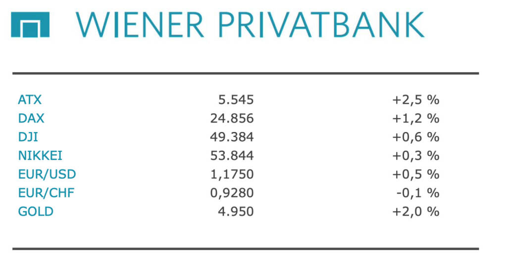 Aus den Morning News der Wiener Privatbank: "Nach der Rücknahme der angedrohten US-Zölle im Grönland-Streit und positiven Signalen aus den Ukraine-Gesprächen haben die Anleger gestern Donnerstag am Wiener Aktienmarkt zugegriffen. Der ATX übersprang dabei erstmals die Hürde von 5.500 Punkten und schloss 2,49 Prozent höher mit 5.544,90 Punkten. Bereits am Mittwochnachmittag hatte der ATX positiv darauf reagiert, dass US-Präsident Donald Trump in seiner Rede in Davos eine Militäraktion zur Übernahme Grönlands ausgeschlossen hatte. Nach europäischem Börsenschluss kündigte Trump zudem an, dass ein Rahmen für ein künftiges Abkommen entstanden sei und die angedrohten Zölle gegen europäische Länder ausgesetzt würden. Zusätzlichen Rückenwind lieferten Hoffnungen auf Fortschritte bei den Friedensbemühungen im Ukraine-Krieg. Trump und der ukrainische Präsident Wolodymyr Selenskyj sprachen von einem guten Treffen in Davos, Selenskyj kündigte zudem trilaterale Gespräche zwischen den USA, der Ukraine und Russland an. Laut US-Sondergesandtem Steve Witkoff könnten die USA der Ukraine im Falle einer Zustimmung zu einem Friedensplan zollfreien Zugang zum US-Markt gewähren.