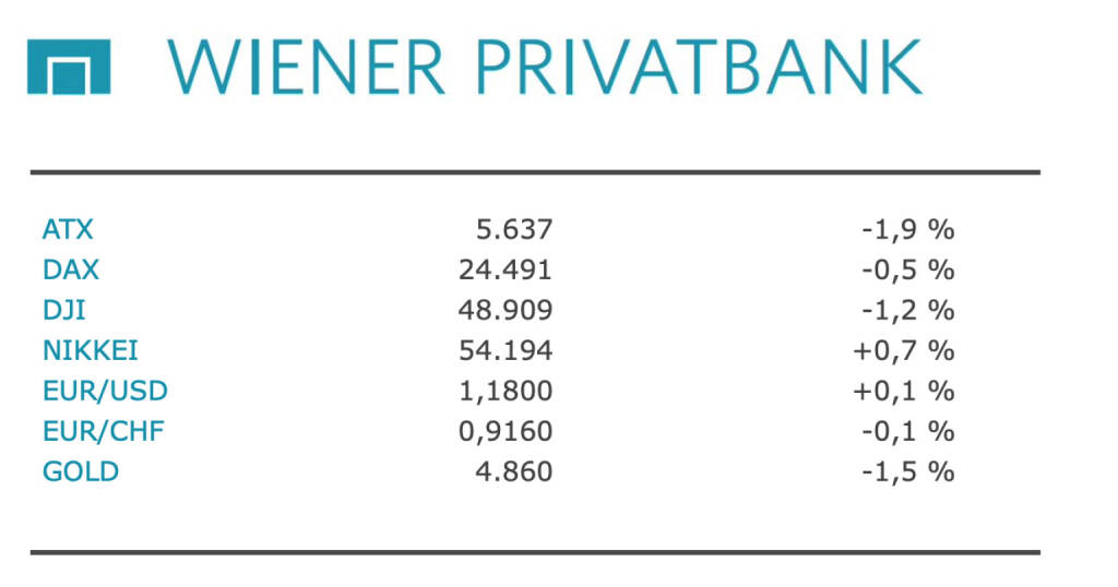 Aus den Morning News der Wiener Privatbank: "In einer international vorsichtigeren Anlegerstimmung und nach teils deutlichen Gewinnmitnahmen im Bankensektor hat der ATX gestern Donnerstag den bisher höchsten Tagesverlust des noch jungen Jahres verbucht. Der Leitindex rutschte von seinem Rekordhoch um 1,93 Prozent auf 5.637,04 Punkte ab. Für den ATX Prime ging es um 1,81 Prozent auf 2.801,53 Zähler nach unten. Auch das europäische Umfeld zeigte sich klar schwächer. Eine ungünstige Gemengelage aus überraschend schwachen US-Arbeitsmarktdaten, anhaltenden Diskussionen über hohe KI-Investitionen und enttäuschenden Nachrichten auf Unternehmensebene schlug den Anlegern aufs Gemüt. Hinzu kamen deutliche Verluste bei Kryptowährungen, während mit den Edelmetallen klassische sichere Häfen ihre Talfahrt fortsetzten.