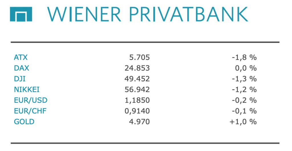 Aus den Morning News der Wiener Privatbank: "Der Wiener Aktienmarkt hat sich am Donnerstag mit deutlich tieferer Tendenz aus dem Handel verabschiedet. Der ATX schloss mit minus 1,77 Prozent bei 5.704,88 Punkten, nachdem der Leitindex am Vortag noch kräftig zugelegt hatte. An den europäischen Leitbörsen gab es mehrheitlich einen negativen Trend zu sehen und an der Wall Street etablierte sich im Handelsverlauf eine sehr schwache Stimmung. Vor allem im Späthandel drückten die Kursabschläge an den US-Börsen auch in Europa auf die Kurse.