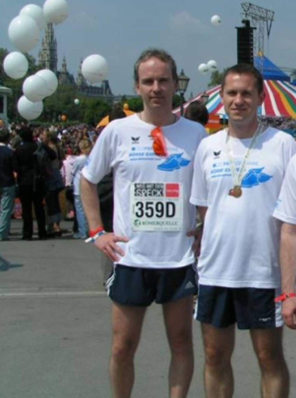 Und wieder eine gute neue Laufidee in Wien: Der Fairness Run von Global 2000. Auf den ersten Blick dachte ich, dass das WirtschaftsBlatt die Flügel vom guten alten Hermeskopf an den Schuh anhängt. Hatten wir seinerzeit auch für WirtschaftsBlatt Online mal gemacht. Das Bild zeigt mich anno dazumal mit Günther Artner von der Erste Group. Zufällig habe ich mir just für heute Abend mit Günther einen Praterlauf ausgemacht. Weitere Läufe HIER.