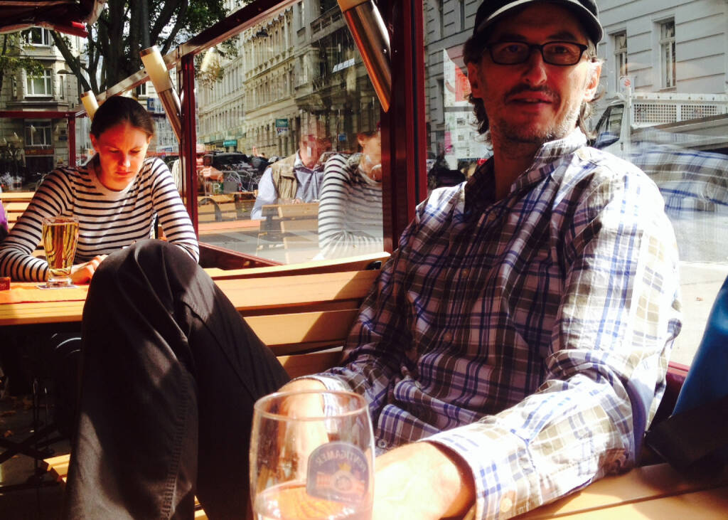 Ziemlich fiebrig bin ich dieser Tage, an Sport nicht zu denken. Beim Börse Social Network stehen jedoch so lässige und riesige Dinge an, dass wir die Update-Sessions einfach brauchen. So auch heute Mittag bei warmem Wetter und Sturm (nicht zum Trinken, für die Stirnhöhlen). Der Plan bis zur Gewinn-Messe wurde mit Josef Chladek ausgeheckt, wir werden da einige Überraschungen fertig haben. Freu mich drauf. Zum Fieber passt das Bild: Da taucht im Spiegelbild einer auf, der in der Direktsicht gar nicht da war.