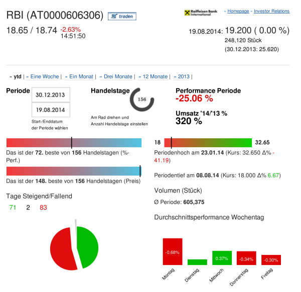 RBI: Letzter Schlusskurs (Euro): 19.200, das ist der 72. beste von 156 Handelstagen (%-Perf.) , das ist der 148. beste von 156 Handelstagen (Preis) , Periodenhoch am 23.01.14 (Kurs: 32.650 Δ% -41.19), Periodentief am 08.08.14 (Kurs: 18.000 Δ% 6.67), 156 Handelstage, davon ↑ 71 → 2 ↓ 83 , Performance Periode: -25.06 %, Umsatz '14/'13: 320 %