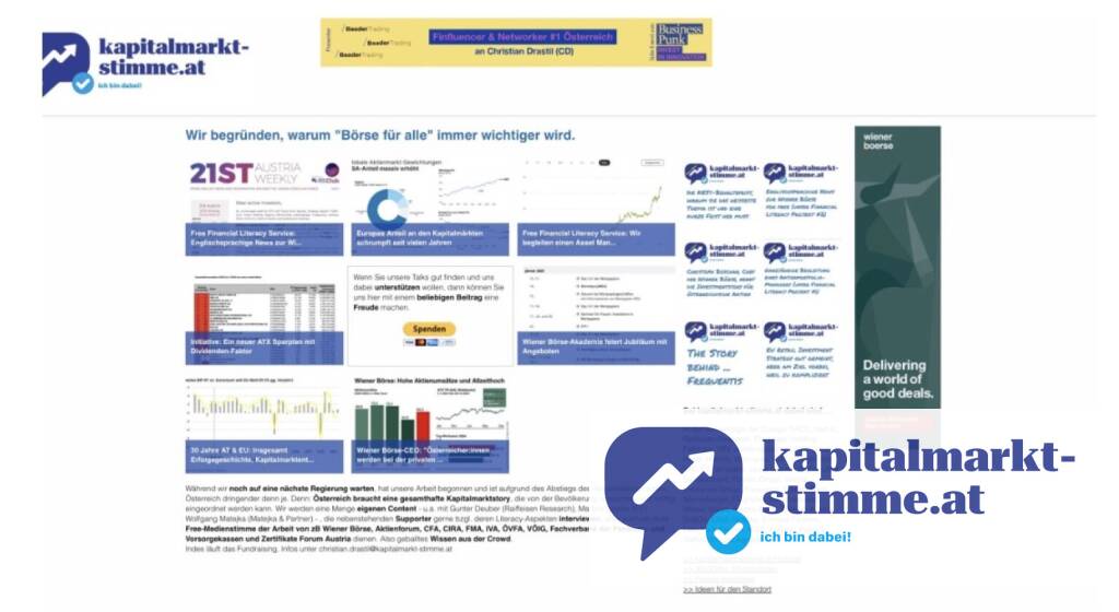 Wir werden eine Menge eigenen Content - u.a. mit Gunter Deuber (Raiffeisen Research), Martina Geisler (EY), Wolfgang Matejka (Matejka & Partner) - , die nebenstehenden Supporter gerne bzgl. deren Literacy-Aspekten interviewen, aber auch als laute Free-Medienstimme der Arbeit von zB Wiener Börse, Aktienforum, CFA, CIRA, FMA, IVA, ÖVFA, VÖIG, Fachverband der Pensions- und Vorsorgekassen und Zertifikate Forum Austria dienen. Also geballtes Wissen aus der Crowd.