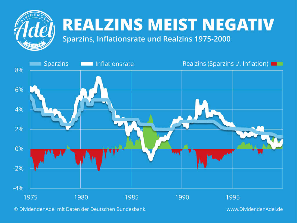 Hier mal, basierend auf Bundesbank-Daten, der Realzins deutscher Spareinlagen von 1975 bis 2000. Mehr als die Hälfte dieses 25-jährigen Zeitraums lag die Inflationsrate über der durchschnittlichen Verzinsung klassischer Sparbücher. Einziger Unterschied zur aktuellen Situation: Dank hoher Nominalzinsen hat seinerzeit kaum jemand darüber nachgedacht, dass man in Kaufkraft gerechnet immer ärmer wurde.