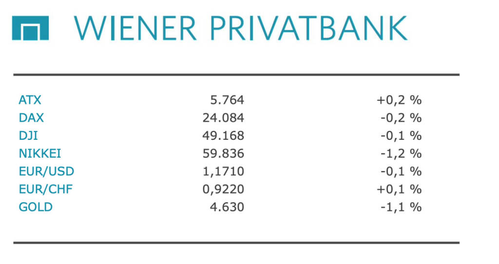 Aus den Morning News der Wiener Privatbank: "Die Wiener Börse hat sich gestern Montag zum Wochenstart mit leichten Gewinnen gezeigt. Der Leitindex ATX gewann 0,17 Prozent auf 5.763,77 Zähler. Der breiter gefasste ATX Prime stieg um 0,14 Prozent auf 2.852,81 Punkte. Das europäische Umfeld präsentierte sich hingegen durchwegs im roten Bereich. Eine neue Verhandlungsrunde zwischen den USA und dem Iran zur Beilegung ihres Krieges zeichnet sich nicht ab. Weder aus Washington noch aus Teheran kamen zu Wochenbeginn offizielle diplomatische Signale. Dafür sicherte Kremlchef Wladimir Putin Teheran bei einem Treffen mit dem iranischen Außenminister Abbas Araqchi in St. Petersburg die weitere Unterstützung Moskaus zu. Er habe vorige Woche eine Botschaft des obersten Führers Mojtaba Khamenei, Sohn des getöteten Ayatollahs Ali Khamenei, erhalten und könne nur bestätigen, dass Russland und der Iran ihre strategische Partnerschaft fortsetzten, sagte Putin. Kremlsprecher Dmitri Peskow erklärte zu dem Treffen, dass eine Rückkehr zu Kampfhandlungen weder im Interesse Teherans noch im Interesse der Weltwirtschaft sei. Russland sei zudem zur Vermittlung in dem Konflikt bereit.