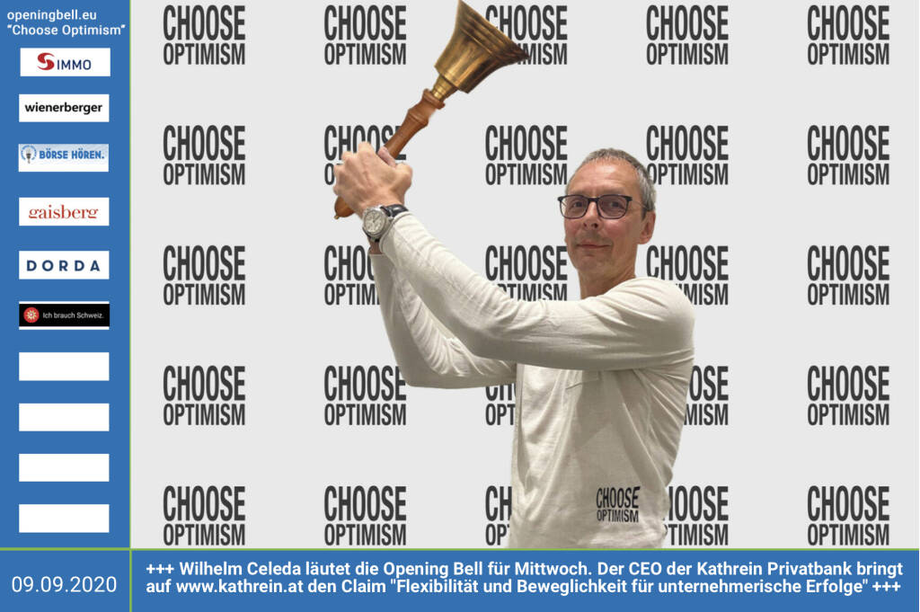 9.9.: Wilhelm Celeda läutet die Opening Bell für Mittwoch, Long Distance Style (vorher/nachher unter https://photaq.com//page/index/3781 ). Der CEO der Kathrein Privatbank bringt auf http://www.kathrein.at den Claim "Flexibilität und Beweglichkeit für unternehmerische Erfolge" mehr Choose Optimism: https://boerse-social.com/category/choose_optimism https://www.facebook.com/chooseoptimism/