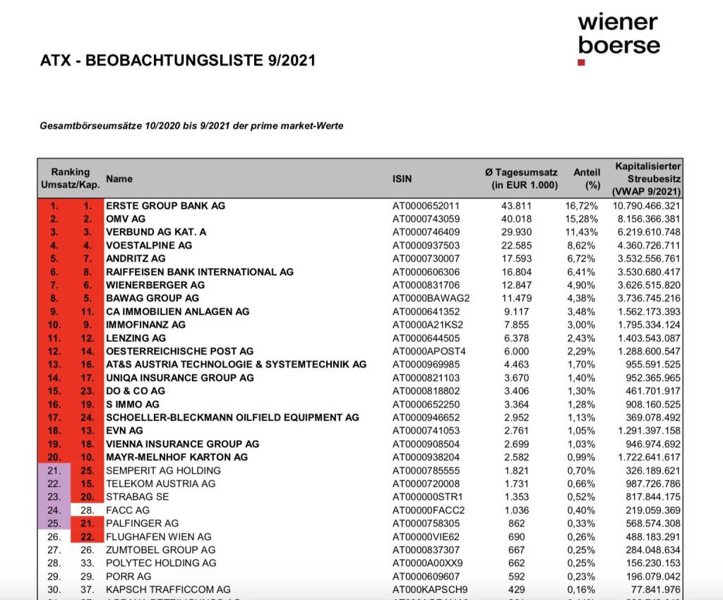 Am Freitag nach Marktschluss hat die Wiener Börse noch die ATX (TR)-Beobachtungsliste 9/2021 veröffentlicht. Diese umfasst die Gesamtbörseumsätze 10/2020 bis 09/2021 der prime market-Werte. Sie hat 7/12 Bedeutung für die nächste Umstellung im März. Die Monate Oktober 2020 bis Februar 2021 werden noch durch Oktober 2021 bis Februar 2022 ersetzt. Und so sieht es aus.