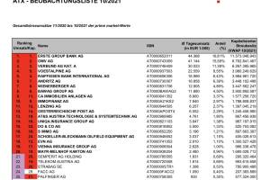 Um 11:08 liegt der ATX TR mit -1.03 Prozent im Minus bei 7556 Punkten (Ultimo 2020: 5466). Topperformer der PIR-Group sind Porr mit +1.48% auf 12.38 Euro, dahinter Andritz mit +0.52% auf 49.96 Euro und Marinomed Biotech mit +0.47% auf 107 Euro. Zum Vergleich der DAX: 15865 (+0.31%, Ultimo 2020: 13719). Die Wiener Börse hat gestern nach Marktschluss die ATX (TR)-Beobachtungsliste 10 2021 veröffentlicht . Diese umfasst die Gesamtbörseumsätze 11 2020 bis 10 2021 der prime market-Werte. Sie hat 8 12 Bedeutung für die nächste Umstellung im März. Die Monate November 2020 bis Februar 2021 werden noch durch November 2021 bis Februar 2022 ersetzt. ATX (TR) : Weiterhin sind die aktuellen 20 lt. Liste einzementiert. SBO hat sich nach Market Cap wieder mehr Luft verschaf... » Weiterlesen