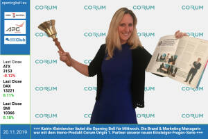 20.11.: Katrin Kleinlercher läutet die Opening Bell für Mittwoch. Die Brand & Marketing Managerin war mit dem Immobilien-Produkt Corum Origin 1. Partner unserer neuen Einsteiger-Fragen-Serie im http: www.boerse-social.com magazine www.corum-investment.at 19.11.: Christoph Weißenbäck läutet die Opening Bell für Dienstag. Der selbstständige Werber, Webdesigner und Journalist aus 1090 launchte dieser Tage das Projekt http: www.stadtpolitik.wien 18.11.: Katharina Riedl mit der Opening Bell für Montag. Die Gründerin der Kommunikationsagentur Image Angels ist passionierte Ultraläuferin, da gehen gerne schon mal 100 Meilen am Stück http: www.image-angels.at http: www.sportgeschichte.at 15.11.: Georg Gesek mit der Openi... » Weiterlesen