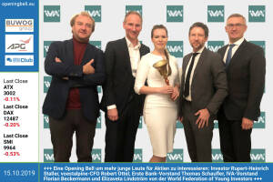 15.10.: Eine Opening Bell, um mehr junge Leute für Aktien zu interessieren: Investor Rupert-Heinrich Staller, voestalpine-CFO Robert Ottel , Erste Bank-Vorstand Thomas Schaufler , IVA-Vorstand Florian Beckermann und Elizaveta Lindström von der World Federation of Young Investors www.boerse-social.com 14.10.: Niki Wiesberger läutet die Opening Bell für Montag. Sein Bruder Bernd Wiesberger hat gestern seinen 7. Titel auf der Europa-Tour geholt. Niki und der Golf-Verband gratulieren www.golf.at http: www.sportgeschichte.at 11.10.: Barbara Schett-Eagle mit der Opening Bell für Freitag. Österreichs Tennis Star (vor 20 Jahren Nr. 7 der Weltrangliste) läutet die entscheidende Phase des Upper Austria Ladies Linz ein www.ladieslinz.at http: www.spo... » Weiterlesen