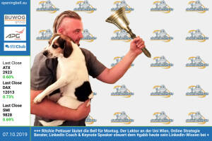 7.10.: Ritchie Pettauer läutet die Opening Bell für Montag. Der Lektor an der Uni Wien, Online Strategie Berater, LinkedIn Coach & Keynote Speaker steuert dem #gabb heute sein LinkedIn-Wissen via Gastkommentar bei datenschmutz.net http: www.boerse-social.com gabb 4.10.: Daniel Steindl läutet die Opening Bell für Freitag. Seine Firma raiseaplant entwickelte Shreba, den Indoorgarten zum Anbau von aromatischem Gemüse zu Hause. Crowdfunding in Kürze www.raiseaplant.com www.viennadesignweek.at 3.10.: Lisa Stolz läutet die Opening Bell für Donnerstag. Mit ihrer jungen Möbelmarke move with wood ist die Wiener Architektin und Möbeldesignerin auf der Vienna Design Week präsent www.lisastolz.com www.viennadesignweek.at 2.1... » Weiterlesen
