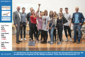 SchülerInnen des Bernoulligymnasiums in Wien 22 läuten die Opening Bell für Mittwoch