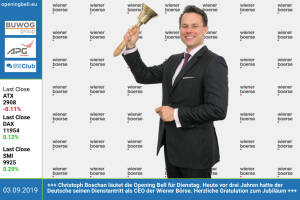 3.9.: Christoph Boschan läutet die Opening Bell für Dienstag. Heute vor drei Jahren hatte der Deutsche seinen Dienstantritt als CEO der Wiener Börse. Herzliche Gratulation zum Jubiläum und ... well done http: www.wienerborse.at 2.9.: Lukas Scherzenlehner läutet die Opening Bell für Montag. Über die HV seiner Cleen Energy berichten wir heute und morgen im Börsenbrief #gabb http: www.boerse-social.com gabb http: cleen-energy.com 30.8.: Franz Wittmann jun. mit der Opening Bell für Freitag. Der Geschäftsführer des Golf & Country Club Schladming Dachstein veranstaltet im September 3 Vergleichskämpfe für Mitglieder http: www.schladming-golf.at http: www.runplugged.com 29.8.: Natascha Tögl läutet die Op... » Weiterlesen