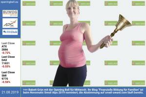 21.8.: Babett Grün mit der Opening Bell für Mittwoch. Ihr Blog "Finanzielle Bildung für Familien" ist beim Novomatic Smeil Alps 2019 nominiert, die Abstimmung auf http: smeil-award.com läuft bereits http: babettgruen.de www.facebook.com groups GeldanlageNetwork 20.8.: Franz Jurkowitsch läutet die Opening Bell für Dienstag. Ein aktuelles Interview mit dem Warimpex-CEO gibt es in der heutigen Ausgabe unseres täglichen Börsenbriefs http: www.boerse-social.com gabb http: www.warimpex.com 19.8.: Vincent Willkomm mit der Opening Bell für Montag. Sein Blog Freaky Finance ist beim Novomatic Smeil Alps 2019 nominiert, die Abstimmung auf http: smeil-award.com läuft bereits http: freakyfinance.net www.facebook.com groups GeldanlageN... » Weiterlesen