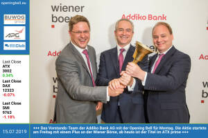 15.7.: Das Vorstands-Team der Addiko Bank, Csongor Németh (Chief Corporate & SME Banking Officer), CEO Razvan Munteanu , CFO Johannes Proksch , mit der Opening Bell für Montag. Die Aktie startete am Freitag, ab heute ist der Titel im ATX prime enthalten. www.facebook.com groups GeldanlageNetwork 12.7.: Werner Lanthaler läutet die Opening Bell für Freitag. Der Evotec-CEO wurde 2018 in die Hall of Fame aufgenommen, er holte sich seine Urkunde heute persönlich im BSN-Office ab. www.evotec.com de www.facebook.com groups GeldanlageNetwork 11.7.: Martin Hinteregger mit der Opening Bell für Donnerstag. Seine Company Lions Capital Partners ist direct market plus Partner und berät Firmen beim Listing an der Wiener Börse http: lionscapitalpartner... » Weiterlesen
