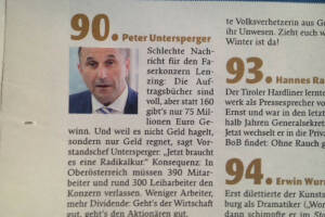Die "Falter"-Redaktion gestaltete jährlich ein Ranking der 100 bösesten Österreicher, der Ausgabe 51-52 13 lag"Best of Böse" bei. Der böseste ATX-Vorstand war Ende 2013 Lenzing-Chef Peter Untersperger. Und so gefährlich es auch ist, "Mann des Jahres" zu werden (da sind einige abgestürzt), so chancenreich ist man als Bösewicht der Falter-Redaktion offenbar für die Zukunft. Lenzing war 2014 mit ca. 29 Prozent Plus die zweitbeste ATX-Aktie. Und der Falter? Der kürt leider gar keine 100 Bösen mehr. Schade. Immer gerne gelesen. » Weiterlesen